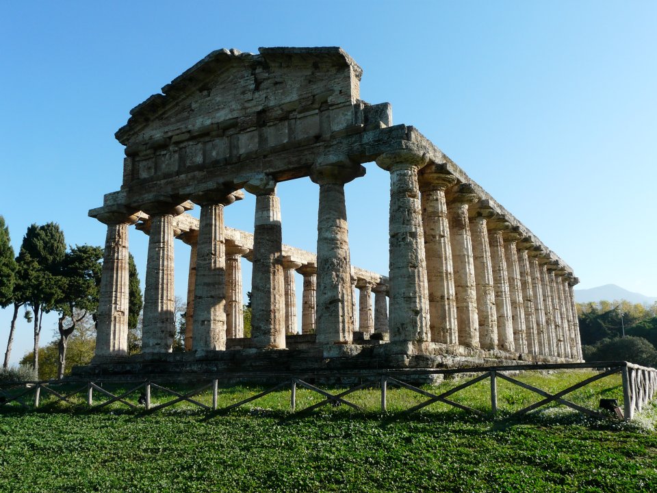 Jetzt mal ohne diesen in den Vordergrund sich drängelnden Klugscheißer: links die Basilika (um 550 v.u.Z.) und rechts der Neptuntempel (um 450 v.u.Z.)